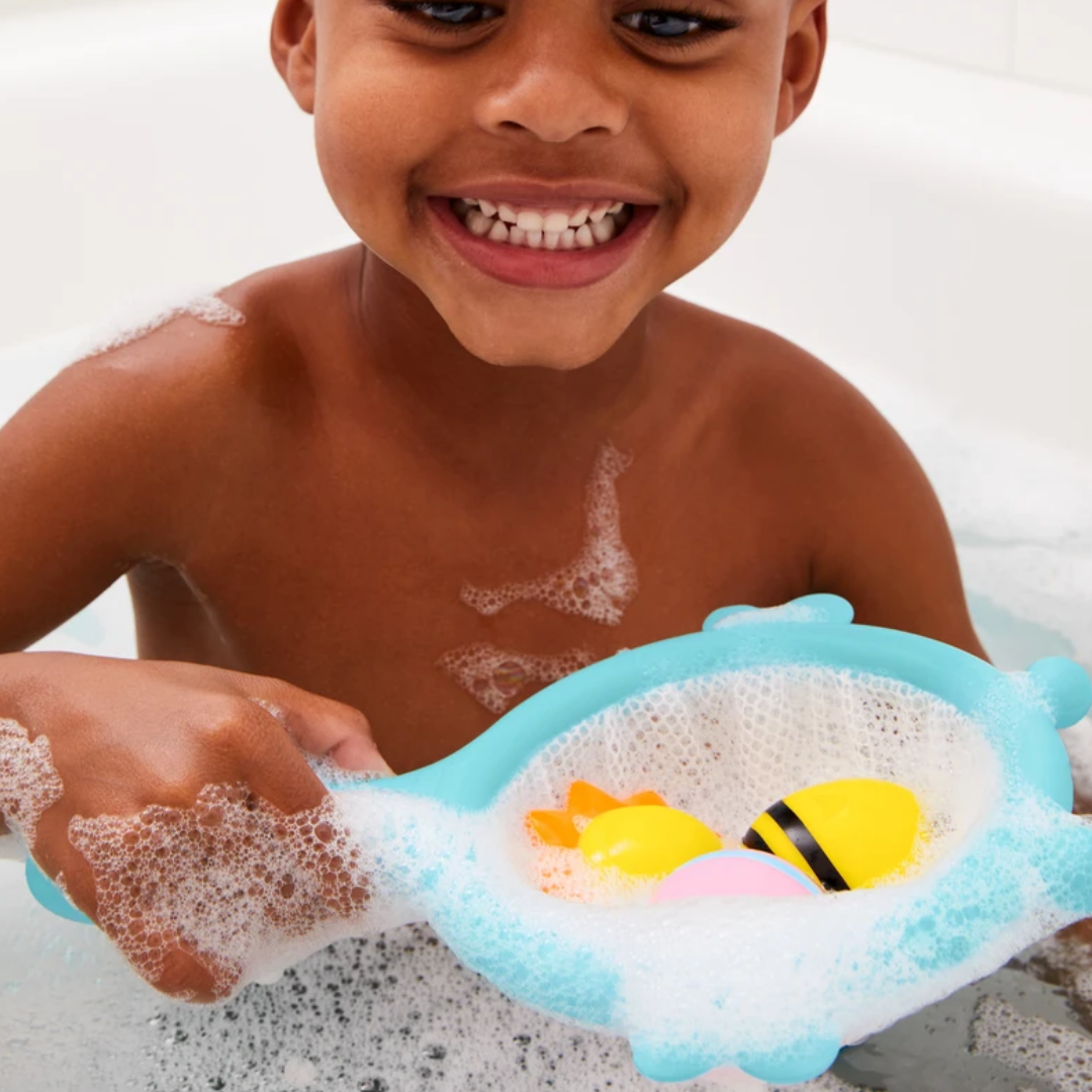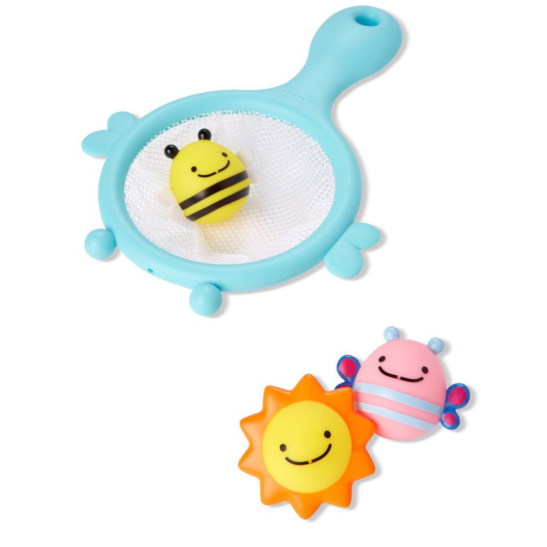 Scoop, squirt, catch, float! Skip Hop's fun little 4 piece set includes a catcher net that’s easy for little hands to grab and hold, plus three adorable squirties for extra bathtime fun, catch them if you can!