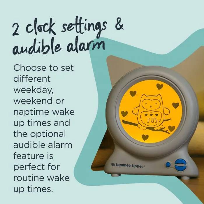 The Groclock is a simple and effective way to help teach children when it is time to sleep and when it is time to get up. Using fun images, the clock shows stars and hearts during sleep time and a yellow sun when it is time to wake, helping kids stay in bed longer and avoid waking parents too early. Older children can also read the digital time or use the optional audible alarm.